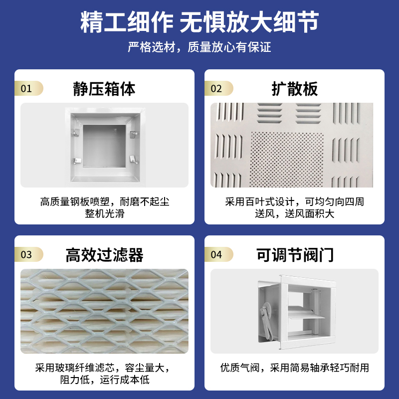 高效送风口为千级、万级、十万级净化空调系统较为理想的终端过滤装置,可广泛于医药、卫生、电子、化工等行业